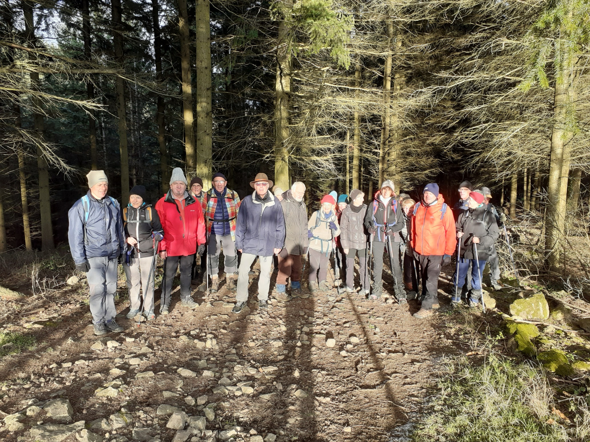 C'est un groupe nombreux de 21 personnes qui est venu profiter du soleil malgré le froid ce samedi 3 janvier; la balade retenue partait du Vieux Cherier et nous a conduit à Goutte Rouge, ainsi nommée à cause des cerisiers à l'automne, puis à Goutte Noire, ainsi nommée à cause des sapins, Ripouroux puis La Salette. Après cette marche de 7 km on s'est retrouvés autour des galettes traditionnelles de l'Epiphanie, bien au chaud dans le chalet de Dominique et Gilles, aux roches Ste Agathe.